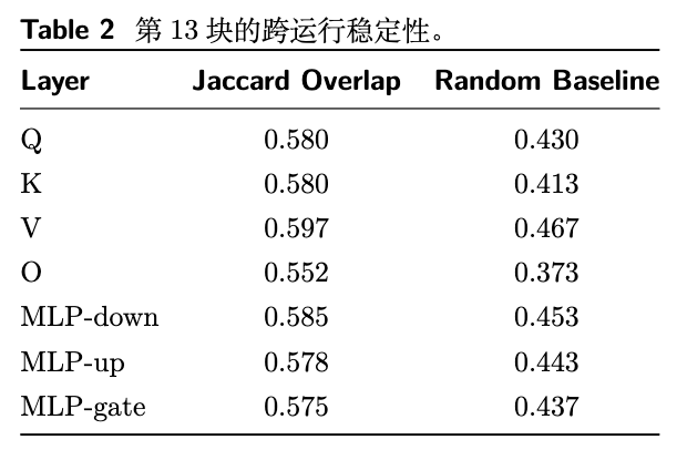 结果如表 2 所示,不同运行之间的 Jaccard Overlap 显著高于随机基线,这证明了 RLVR 的参数更新并非随机,而是具有高度的一致性。无论训练数据和具体 RL 算法如何变化,只要预训练的基座模型固定,更新就会稳定地作用于同一片参数子集上。这揭示了一种“模型条件”(model-conditioned)的特性——优化的路径似乎是由模型自身的初始状态预先“设定”好的。