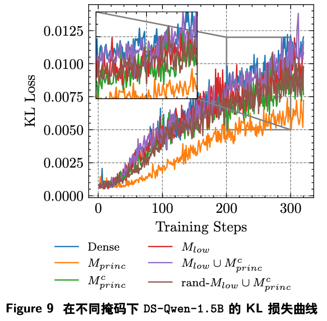 结果如图 9 所示,只更新主权重的 M_princ 策略,其 KL 曲线增长最慢,最终精度也最低,表明学习受到了严重阻碍。这证实了强迫 RLVR 沿着 SFT 的路径走是低效的。与之形成鲜明对比的是,“安全掩码”策略的 KL 曲线与全参数微调(Dense)的轨迹最为接近,最终也取得了相当的性能。