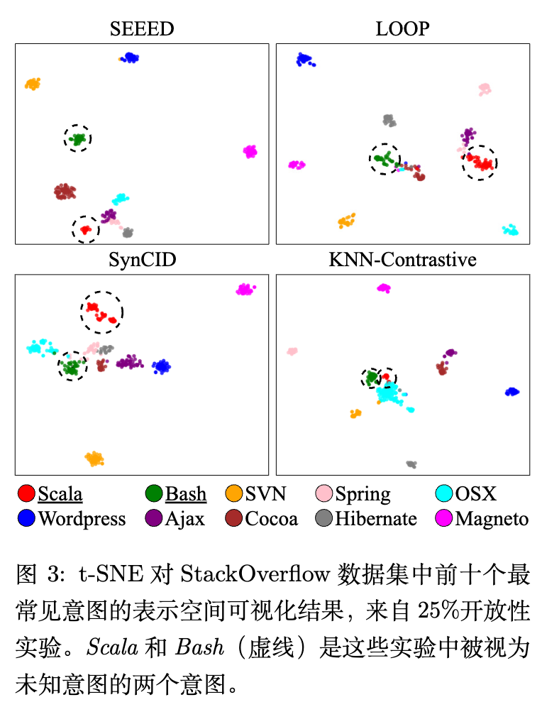 t-SNE 可视化结果也直观地展示了 SEEED 的优势。相比其他方法,SEEED 生成的表示空间中,无论是已知意图还是未知意图(如图中的 Scala 和 Bash),都形成了更紧凑、边界更清晰的簇,这有利于后续的分类和发现。