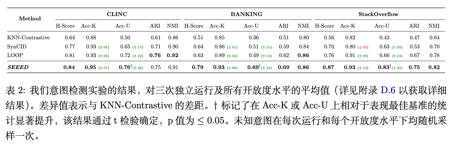 为了测试 SEEED 方法的普适性,作者将其应用于开放世界意图检测任务。结果显示,SEEED 在 CLINC、BANKING 和 StackOverflow 数据集上同样取得了最佳性能,尤其是在未知意图的发现准确率 (Acc-U) 上提升显著。例如,在 StackOverflow 数据集上,相比 LOOP,Acc-U 提升了 17 个百分点。这表明 SEEED 的核心思想(摘要+编码器+LBSR+软聚类)不仅仅适用于错误检测,对于其他广义类别发现任务也具有泛化潜力。