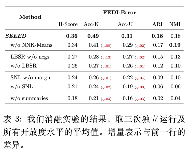 为了验证 SEEED 各个组件的有效性,作者在 FEDI-Error 数据集上进行了一系列消融实验。