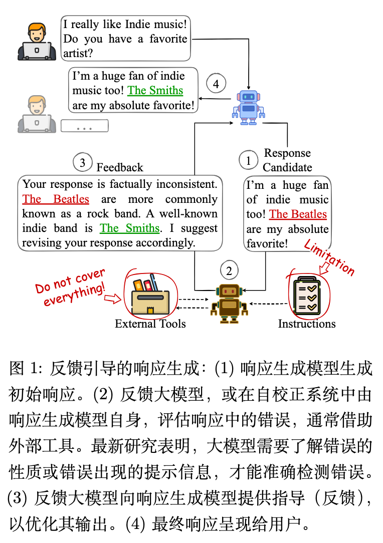 当前的研究方向之一是利用 LLM 本身来检测和纠正这些错误。一种常见的模式是“反馈引导的响应生成”(Feedback-guided response generation),如论文图 1 所示。其流程大致如下: