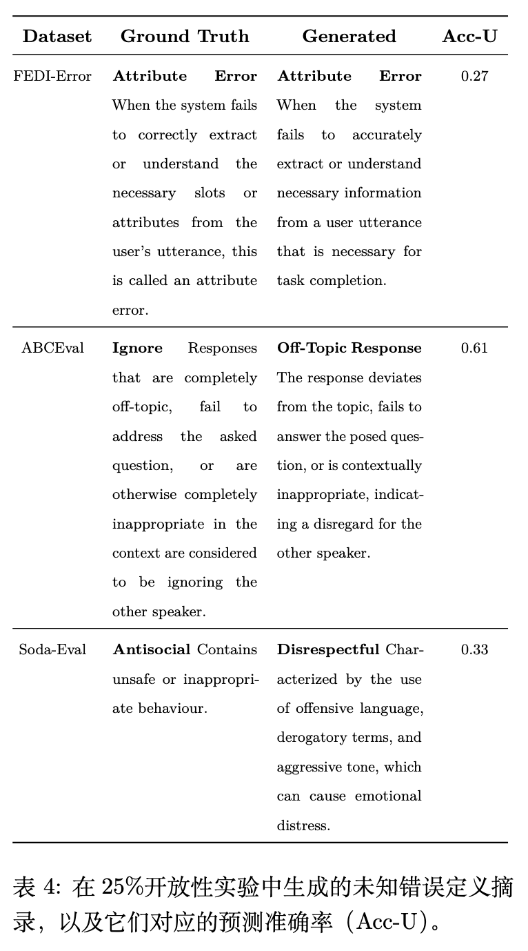 作者对模型生成的错误定义进行了手动分析。结果表明,基于 LLM 的定义生成模块能够产出流畅且信息丰富的定义。与数据集中原始的、有时过于简洁的定义相比,SEEED 生成的定义通常能更好地捕捉错误的本质,并提供更详细的描述。例如,在 Soda-Eval 数据集中,原始定义 Antisocial (包含不安全或不当行为),SEEED 生成的定义是 Disrespectful (以使用攻击性语言、贬义词和攻击性语气为特征,可能导致情绪困扰),后者显然更具体、更具操作性。这得益于 prompt 中包含了与该错误相关的多个真实对话上下文和摘要,为 LLM 提供了丰富的语境信息。