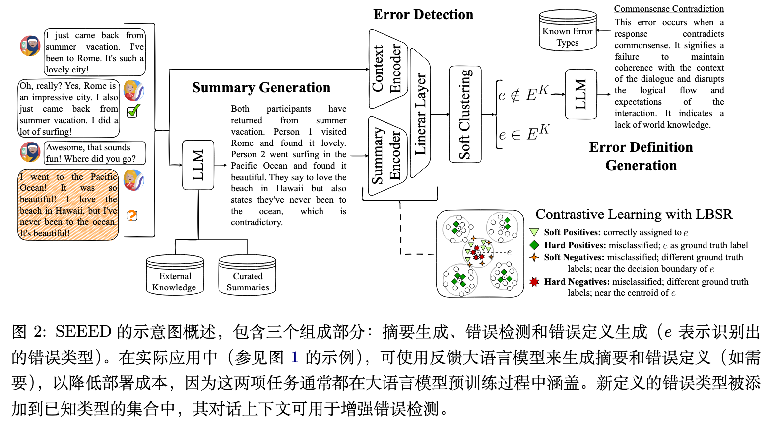 为此,他们设计了一个名为 SEEED (Soft Clustering Extended Encoder-Based Error Detection) 的模型。SEEED 的核心思想是结合一个开源的语言模型(用于生成对话摘要)和轻量级的编码器来进行错误检测。技术上的主要贡献点有两个: