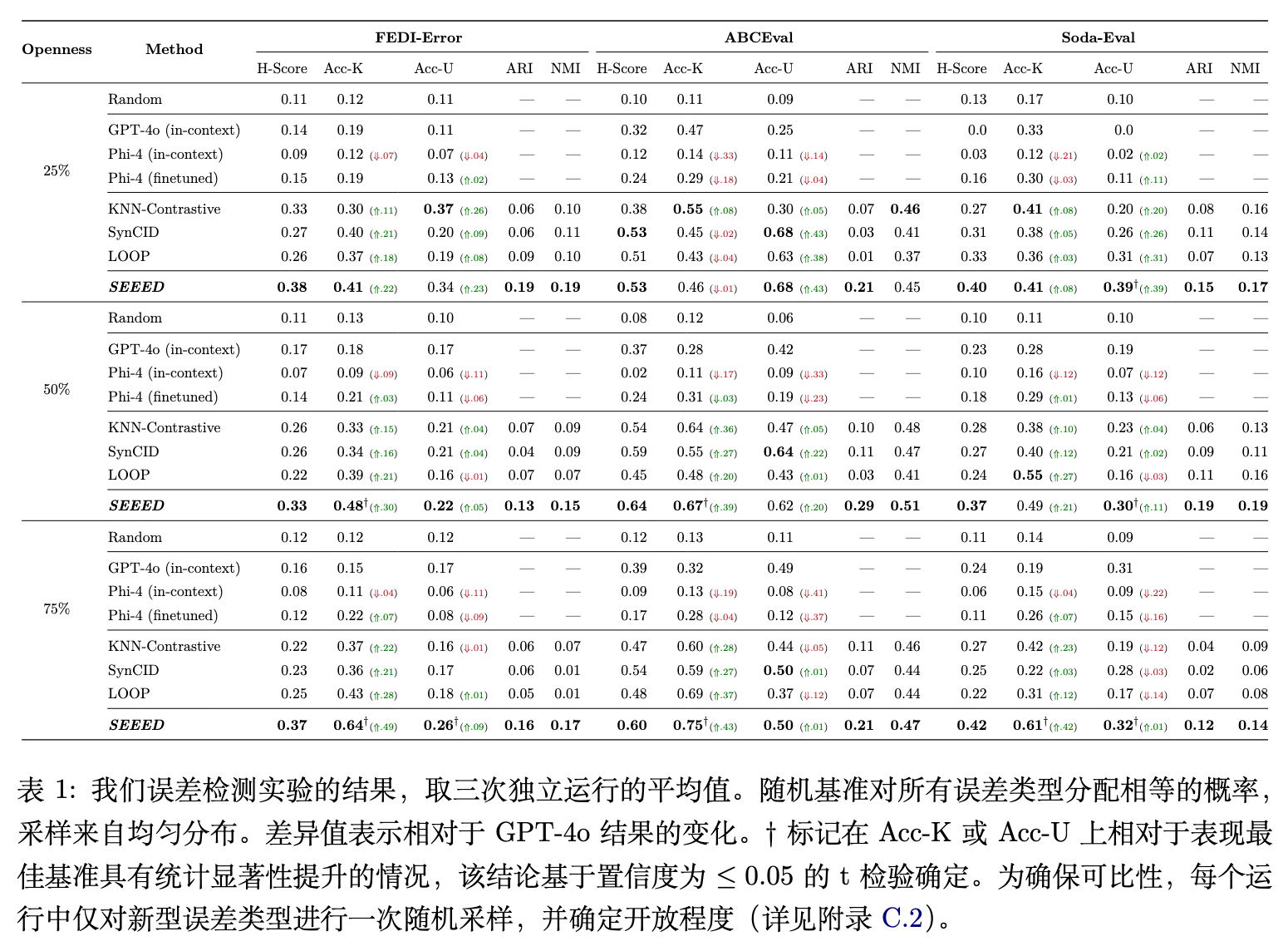 对比 LLM Baselines: LLM(尤其是 Phi-4)在直接进行错误检测时表现不佳,有时甚至低于随机猜测的基线。即便是经过微调,Phi-4 对未知错误的检测能力提升也有限。这表明,在没有明确指令的情况下,LLM 难以识别和泛化到新的错误类型。GPT-4o 表现稍好,但仍逊于 SEEED,并且论文指出 GPT-4o 容易混淆定义重叠的错误类型(例如 ABCEval 中的 Commonsense Contradiction和Uninterpretable)。 -