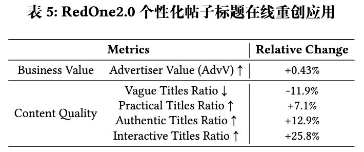 线上A/B测试结果显示,使用RedOne 2.0生成的标题,在商业价值指标(Advertiser Value)上提升了0.43%,内容质量指标(如减少模糊标题、增加互动性标题)也有显著改善。这为该框架的实际应用价值提供了直接证据。