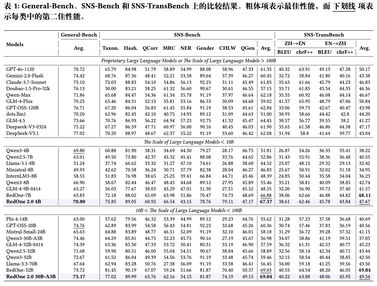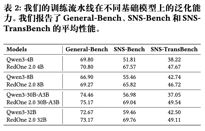 数据效率:论文摘要中提到,RedOne 2.0 相比基础模型实现了约 8.74 的平均性能提升,且所需数据量不足以 SFT 为核心的方法 RedOne 的一半。这说明RL为主导的范式在数据利用效率上可能优于单纯依赖大规模SFT的方法。