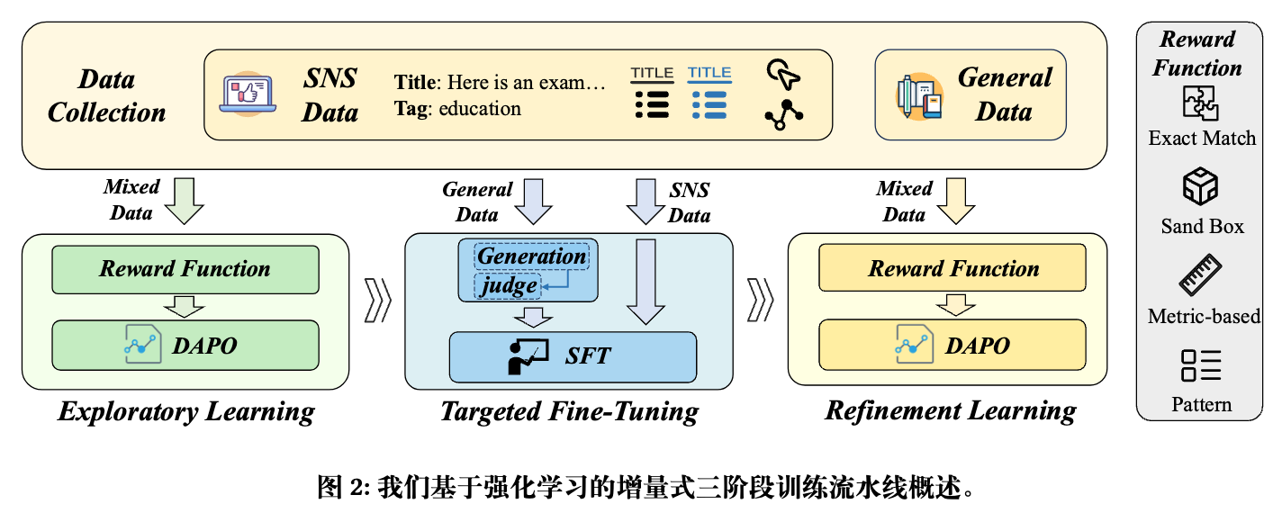 探索性学习(Exploratory Learning): 利用RL让模型初步接触并对齐SNS领域的语料,同时暴露和诊断模型在特定SNS任务上的能力短板。 -