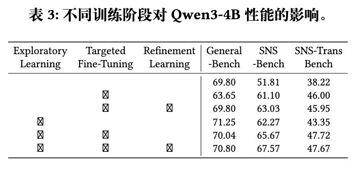 阶段一(探索性学习):在基础模型Qwen3-4B上只进行第一阶段的RL训练后,模型在三个基准上都有了显著提升。有趣的是,通用能力(General-Bench)的提升幅度甚至大于SNS专业能力,这可能说明RL的探索过程本身也能激发模型的通用潜力。 -