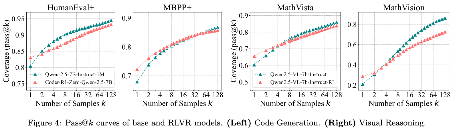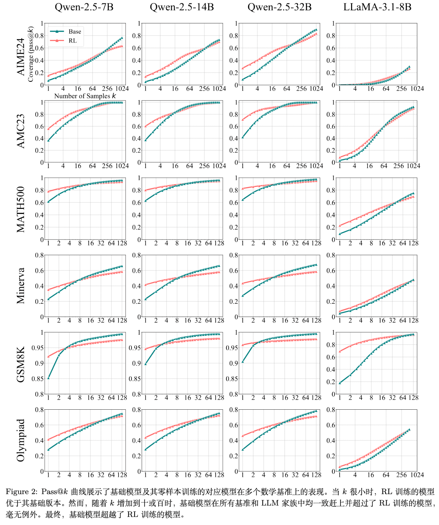 k值(例如k=1)时,经过 RLVR 训练的模型表现优于基础模型;但随着k值的增大,基础模型的性能会反超 RLVR 模型。这表明基础模型本身就拥有更广泛的潜在解题能力(reasoning coverage),而 RLVR 只是让模型更“高效地”找到那些正确的解题路径。 -