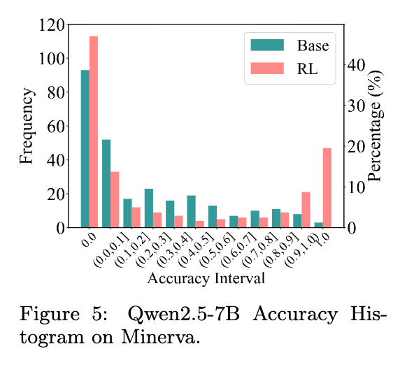 如图所示,与基础模型(Base)相比,RLVR 模型(RL)在高准确率区间(如 0.9-1.0)的频率显著增加,而在低准确率区间的频率降低。这解释了为什么 RL 模型的