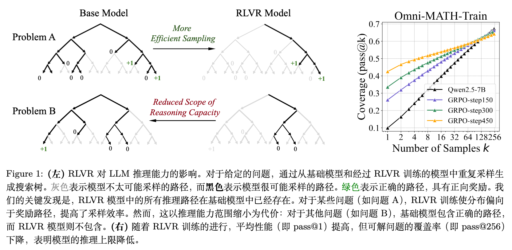 上图直观地展示了论文的核心观点。对于问题 A,基础模型(Base Model)的采样空间中包含了正确的推理路径,但这些路径可能概率较低,采样效率不高。RLVR 模型通过训练,提高了正确路径的采样概率,实现了更高效的采样(More Efficient Sampling)。然而,对于问题 B,基础模型中原本存在正确的解法,但经过 RLVR 训练后,模型的推理能力范围收缩(Reduced Scope of Reasoning Capacity),反而失去了解决该问题的能力。右侧的 pass@k 曲线图更具体地显示了这一趋势:随着训练的进行(GRPO-step150 到 step450),模型的平均性能(pass@1)在提升,但其能力覆盖范围(pass@256)却在下降。