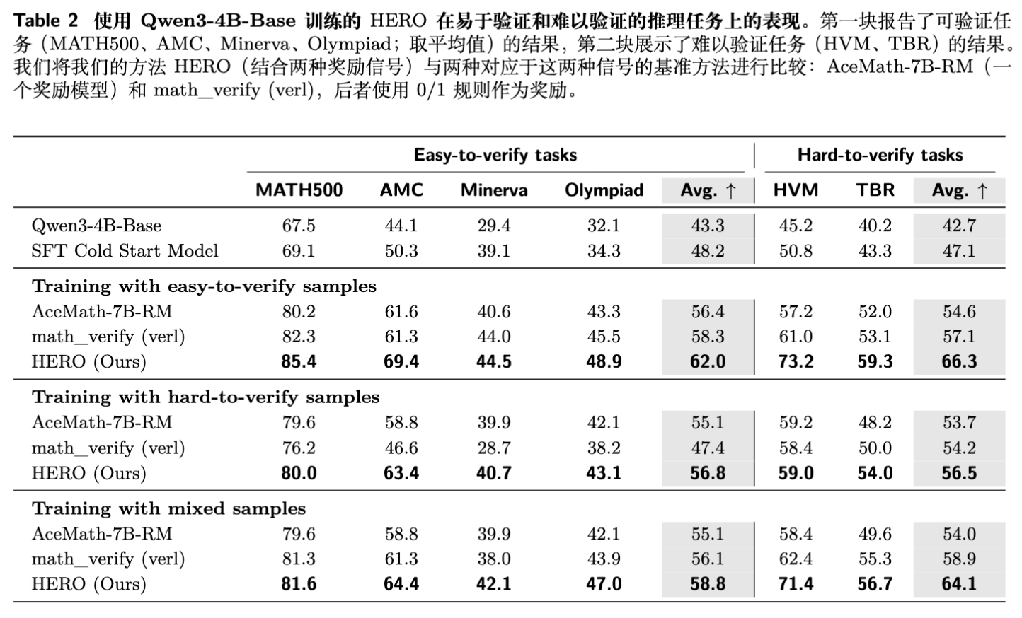 方差感知加权 (Variance-aware Weighting) ,该机制会动态地增加那些模型表现出较大不确定性(即奖励模型打分方差较大)的困难样本在训练中的权重,从而提高训练效率。论文通过在多个数学推理基准上的实验证明,HERO 在各种设置下均优于仅使用验证器或仅使用奖励模型的基线方法,显示出该混合奖励设计在保持验证器稳定性的同时,有效利用了奖励模型的细粒度信息来提升模型的推理能力。
