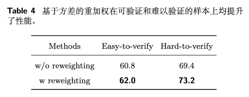 方差感知加权的作用:消融实验证实,加入方差感知加权后,模型在易于验证和难以验证的任务上性能都有提升,尤其是在难以验证的任务上提升了 3.8 个点(从 69.4 到 73.2)。这说明将训练资源向困难样本倾斜是一种有效的策略。