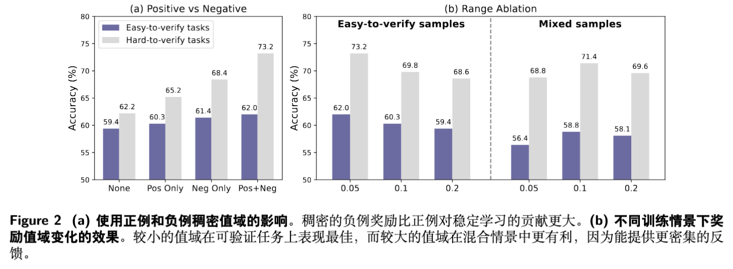 正负奖励范围的作用:实验发现,在错误响应组(负奖励范围)中引入密集信号比在正确响应组中引入密集信号更为重要。这是因为惩罚多样化的错误能够提供比奖励相似的正确答案更丰富的学习信号,帮助模型更好地理解“为什么错”以及“如何改进”。
