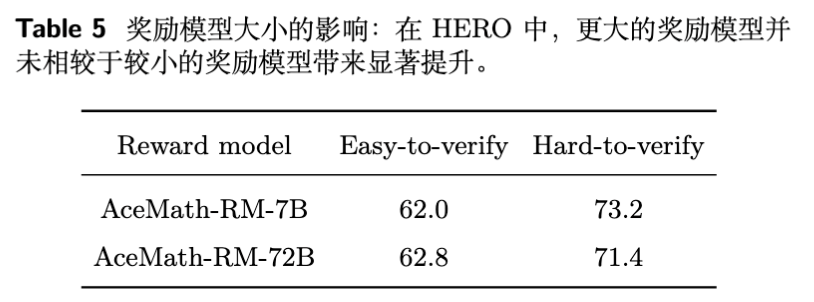 奖励模型大小的影响:一个有趣且重要的发现是,将 HERO 中的 7B 奖励模型换成一个更大的 72B 奖励模型,性能并没有显著提升,在难以验证的任务上甚至略有下降。这表明 HERO 的性能增益主要来自于其结构化的奖励设计,而非奖励模型本身的大小。这一结论对于方法的实用性和部署成本具有积极意义。