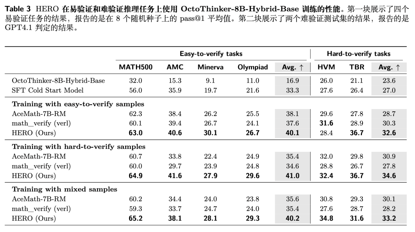 这是 HERO 设计中最有价值的部分。在 HVM 和 TBR 这类任务上,规则验证器因为其脆弱性而难以提供有效信号,而奖励模型又容易产生信号漂移。HERO 通过分层归一化,用验证器(即使不完美)来“锚定”奖励信号的范围,有效防止了奖励 hacking,同时利用 RM 的密集信号来学习部分正确或格式新颖的答案。例如,在易验证数据上训练后,HERO 在难验证任务上比 RM-only 高出 11.7 分,比 Verifier-only 高出 9.2 分,这是一个相当大的提升。