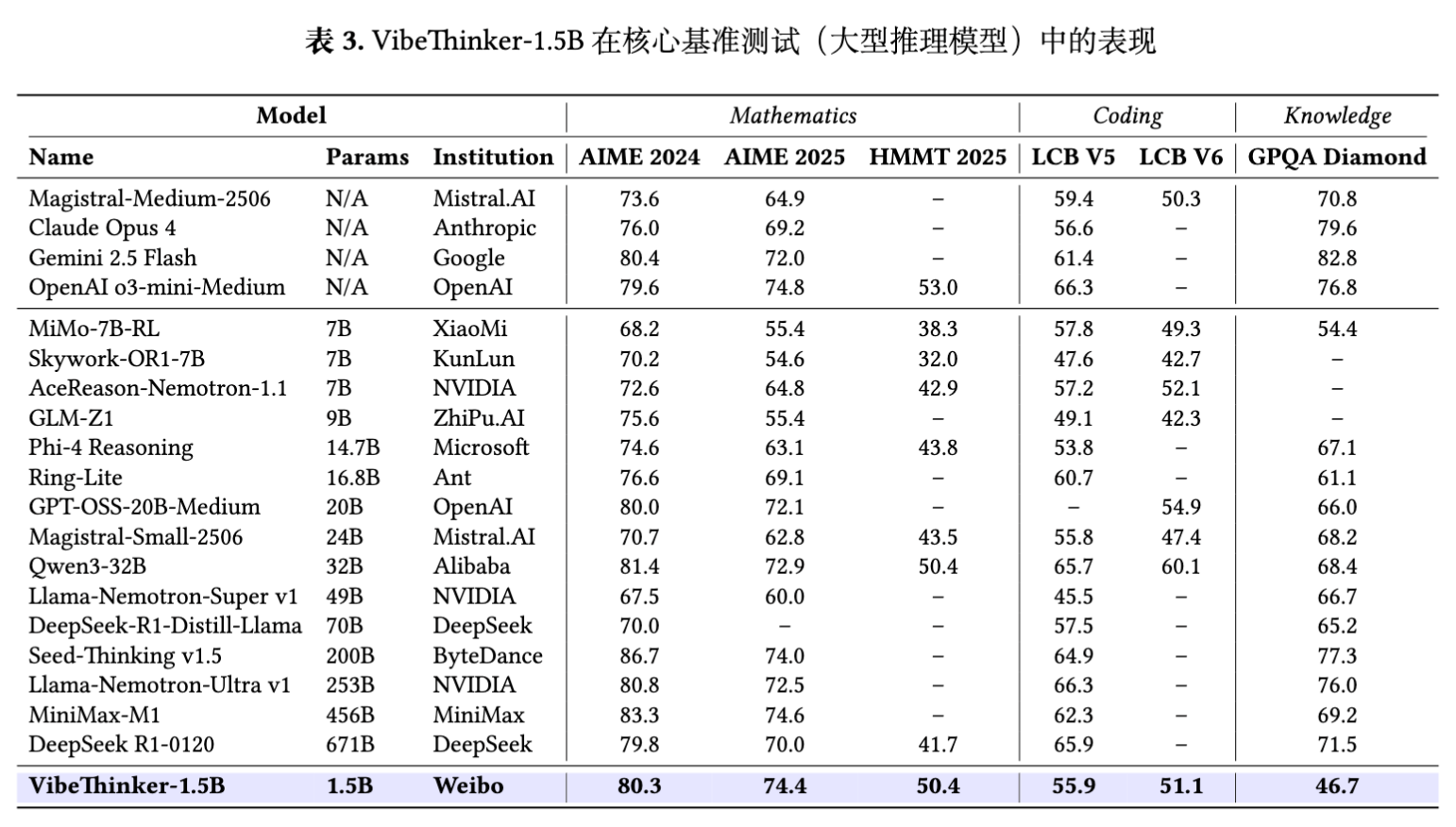 为了全面评估 VibeThinker-1.5B 的推理能力,实验覆盖了数学、代码和知识三个关键领域。