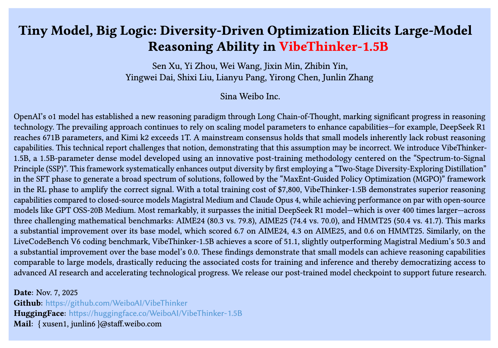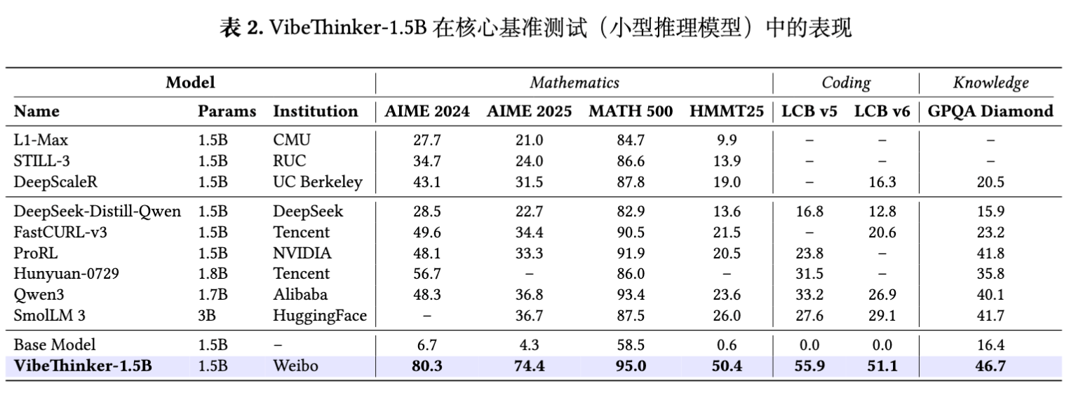 WeiboAI 的这篇技术报告《Tiny Model, Big Logic: Diversity-Driven Optimization Elicits Large-Model Reasoning Ability in VibeThinker-1.5B》对上述问题提出了不同的看法。报告的主张是,通过在后训练阶段进行专门的算法设计,一个 1.5B 参数量的小型模型 VibeThinker-1.5B,也能够在多个具有挑战性的推理基准上,取得与顶尖大型模型相媲美的性能。