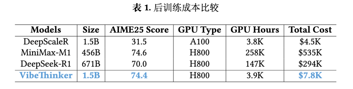 VibeThinker-1.5B 的一个突出特点是其极低的后训练成本。由于模型架构紧凑(1.5B 参数),整个 SFT 和 RLVR 阶段在 NVIDIA H800 GPU 上总共消耗了约 3900 个 GPU 小时。按照 H800 每小时 2 美元的市价计算,总计算成本不到 8000 美元。