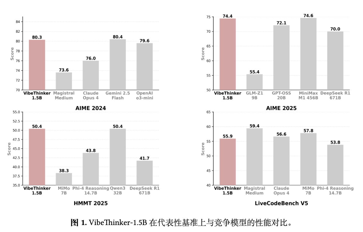 此外,基础模型本身在 LiveCodeBench v5 和 v6 上的得分为 0.0,而 VibeThinker-1.5B 通过后训练分别提升至 55.9 和 51.1,也进一步佐证了后训练方法的有效性。