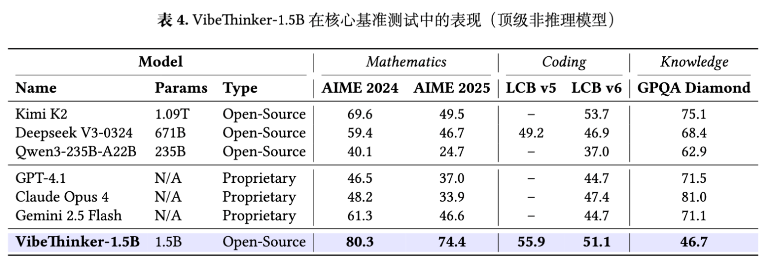 报告还将 VibeThinker-1.5B 与一些顶级的非推理模型进行了比较。这些模型(如 Kimi K2, Deepseek V3, GPT-4.1)虽然没有专门针对长链推理进行优化,但它们巨大的参数规模和海量的训练数据使其本身也具备了处理数学和代码任务的能力。