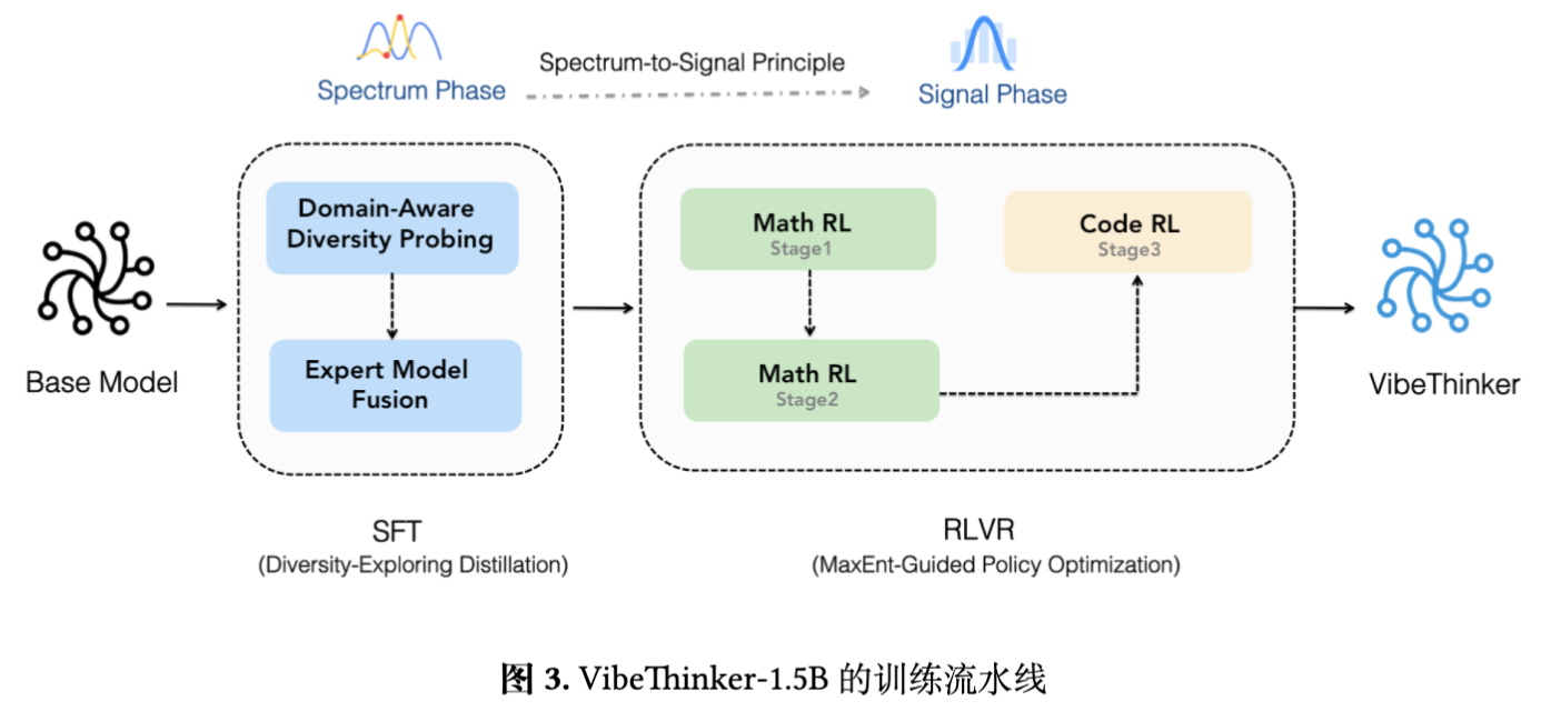 该模型不仅在 AIME24、AIME25 和 HMMT25 等数学竞赛基准上超越了 DeepSeek R1 (671B),还在 LiveCodeBench V6 编程基准上取得了有竞争力的分数。该工作的一个核心贡献是提出并实践了一套名为“光谱-信号原理”(Spectrum-to-Signal Principle, SSP)的后训练框架。这一框架重新定义了监督微调(SFT)和强化学习(RL)在提升推理能力任务中的角色,主张 SFT 阶段的核心目标应是最大化模型输出的多样性(光谱),而非传统的单点准确率;随后的 RL 阶段则从这个多样化的输出中学习,放大正确推理路径的概率(信号)。
