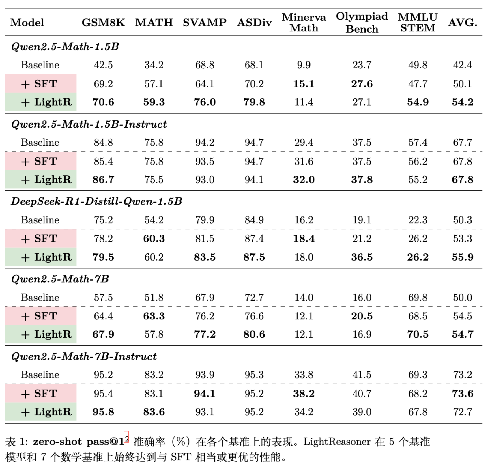 评估基准:GSM8K (分布内), MATH, SVAMP, ASDiv, Minerva Math, OlympiadBench (分布外泛化)。