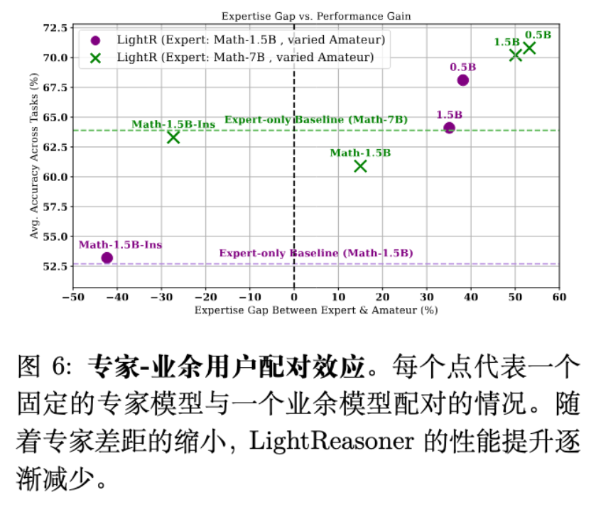 如果使用一个经过指令微调的强模型(Instruct版)作为 Amateur,由于其与 Expert 的差距缩小,对比信号减弱,LightReasoner 的收益随之下降。 -