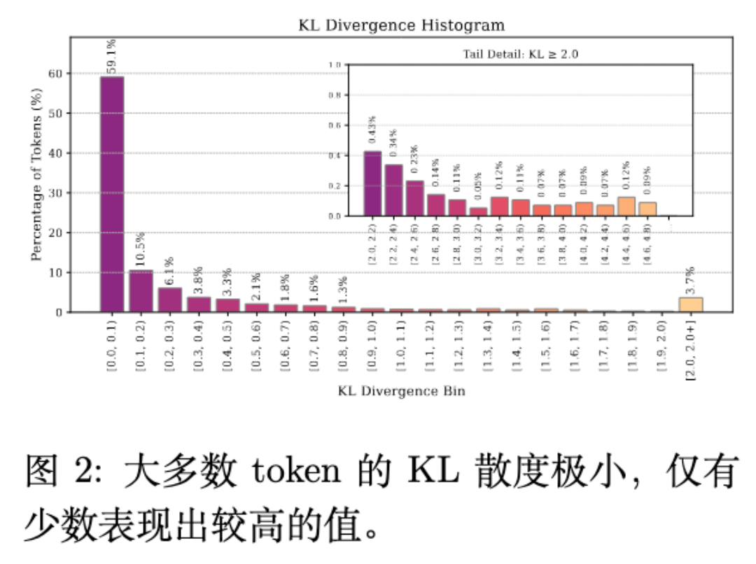如图 2 所示,大部分 token 的 KL 散度都集中在 区间,证明了推理过程中信息分布的稀疏性。