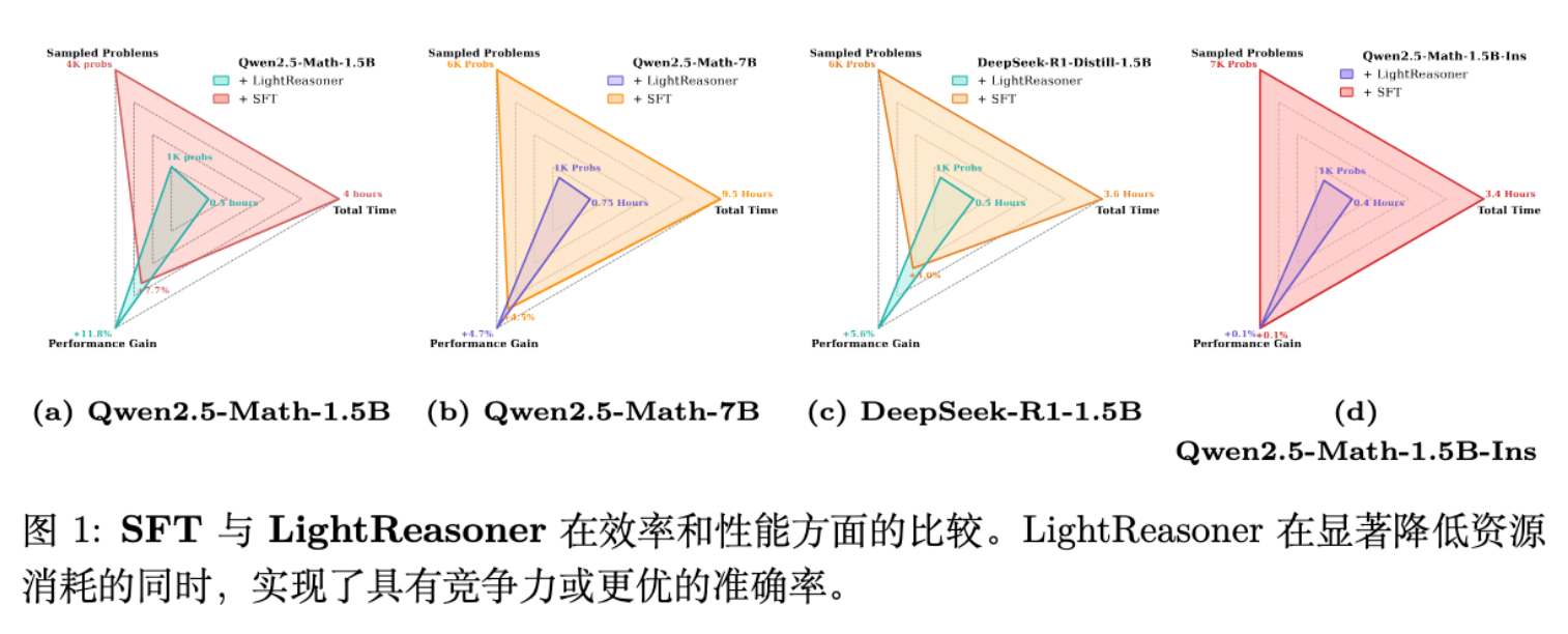 时间成本:SFT 需要 4.0 小时(以 1.5B 模型为例),LightReasoner 仅需 0.5 小时,减少 87.5% 。 -