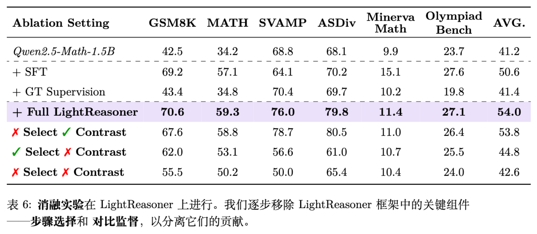 泛化能力强:虽然只在 GSM8K(小学数学)上训练,但模型在 MATH(高中竞赛数学)上的提升依然显著(+2.2% vs SFT)。这表明 LightReasoner 学到的是通用的推理模式,而非简单的数据记忆。