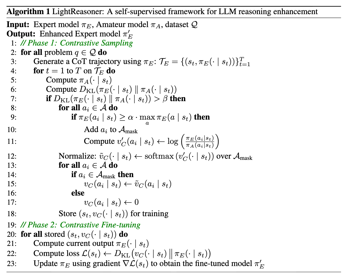 微调阶段:构建对比监督信号(Contrastive Supervision),在不依赖 Ground Truth(真实标签)的情况下,通过最大化 Expert 与 Amateur 的行为差异来强化 Expert 的推理模式。