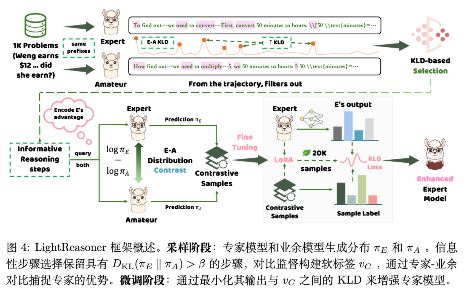 采样阶段:利用 Expert 和 Amateur 在同一上下文下的预测分布计算 KL 散度,筛选出 Expert 显著优于 Amateur 的“关键步骤”。 -