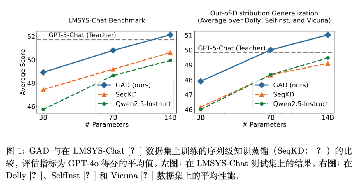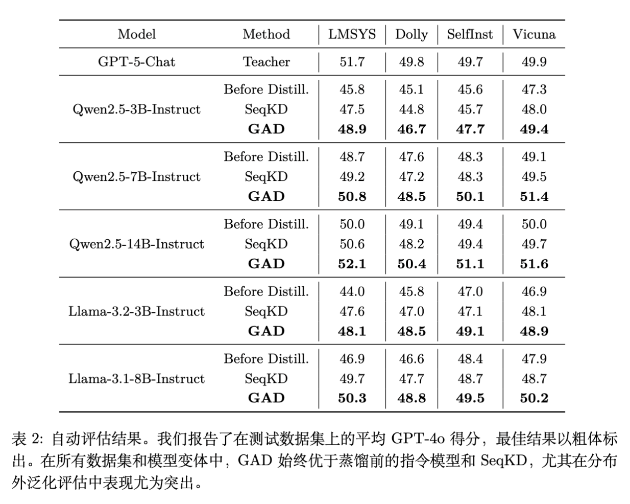 GAD 将学生模型视为生成器(Generator),将一个判别器(Discriminator)视为动态奖励模型,通过极小极大博弈(Minimax Game)进行训练。该方法在不访问教师模型内部参数的情况下,实现了 On-Policy(在线策略) 学习。实验表明,GAD 在 LMSYS-Chat 等基准测试上稳定超越了传统的序列级知识蒸馏(SeqKD),并在域外(OOD)泛化任务上表现出更强的鲁棒性。值得注意的是,经过 GAD 蒸馏的 Qwen2.5-14B-Instruct 在自动评估中表现接近其教师模型 GPT-5-Chat。