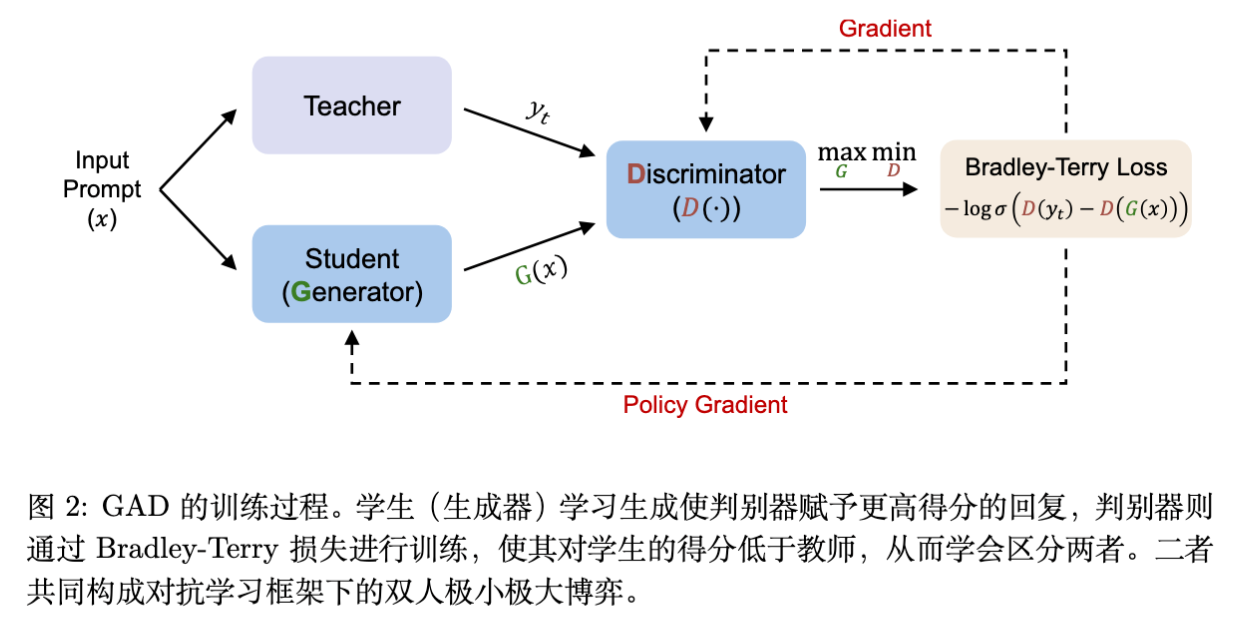 GAD 提供了一个重要的思路:当无法获取强监督信号(如 Logits)时,可以通过构建对抗环境,利用辅助模型(判别器)来模拟环境反馈,从而将模仿学习问题转化为强化学习问题。