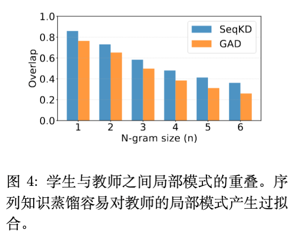现象: SeqKD 模型的 N-gram 重叠率显著 高于 GAD 模型。 -
