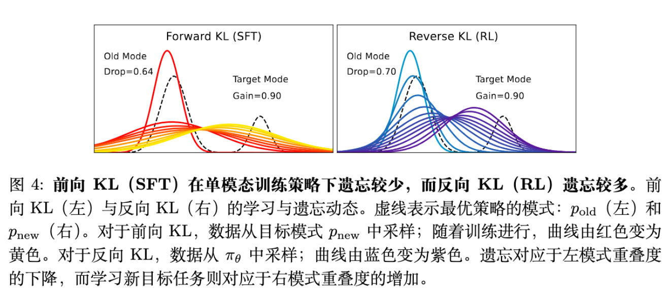 机制: 在多模态分布假设下,RL 对应的 Reverse KL 目标函数具有 Mode-seeking 特性,能够独立地偏移新任务对应的 Mode,而不破坏代表旧知识的 Mode。相比之下,SFT 的 Forward KL 倾向于拉伸整个分布,导致旧知识的概率质量流失。 -