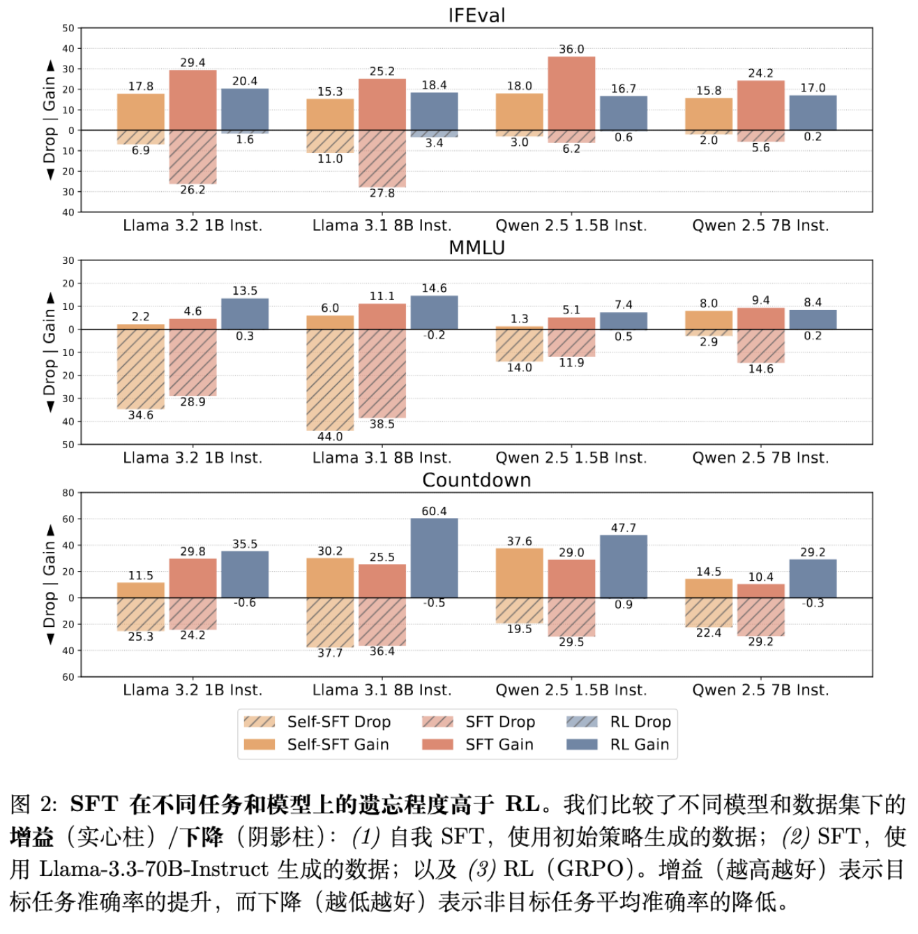为了确保研究的前提立得住,作者首先在 Llama 3 和 Qwen 2.5 系列模型上,针对指令遵循(IFEval)、通用知识(MMLU)和数学推理(Countdown)任务进行了广泛的实验。