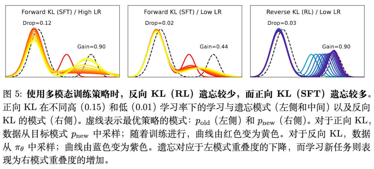 然而,实验事实是 SFT(Forward KL)遗忘更严重。为了解决这个矛盾,作者引入了 多模态(Multi-modal)分布 的假设。