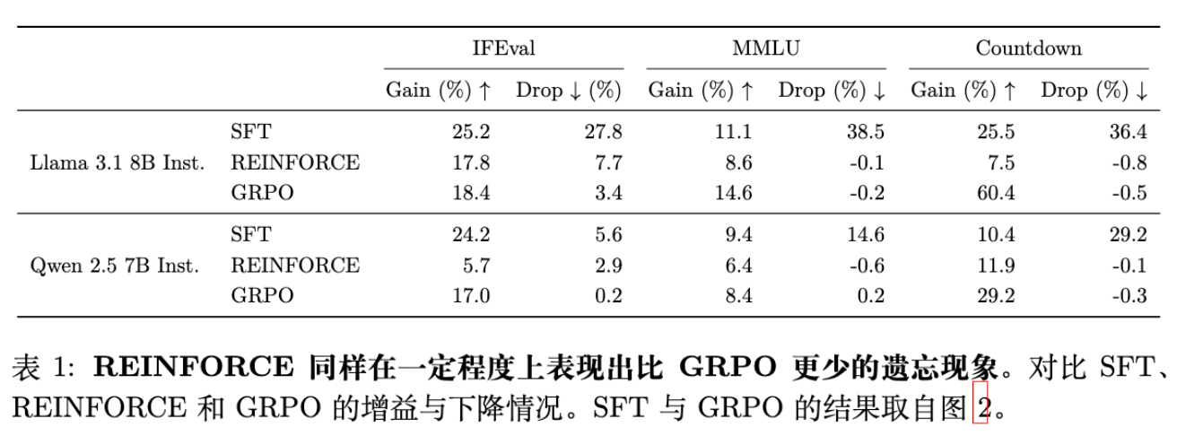 Lai et al. 认为优势估计是关键。本文通过 REINFORCE 实验反驳了这一点,证明即使没有复杂的优势估计,只要是 On-Policy 采样,遗忘就很低。 -