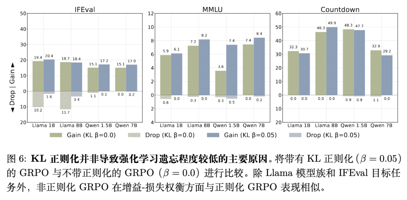 实验结果显示,除了 Llama 模型在 IFEval 任务上的特例,无论是否有 KL 正则化,GRPO 在 Gain-Drop 权衡曲线上的表现几乎一致。这意味着 KL 正则化并不是阻止遗忘的主要因素。