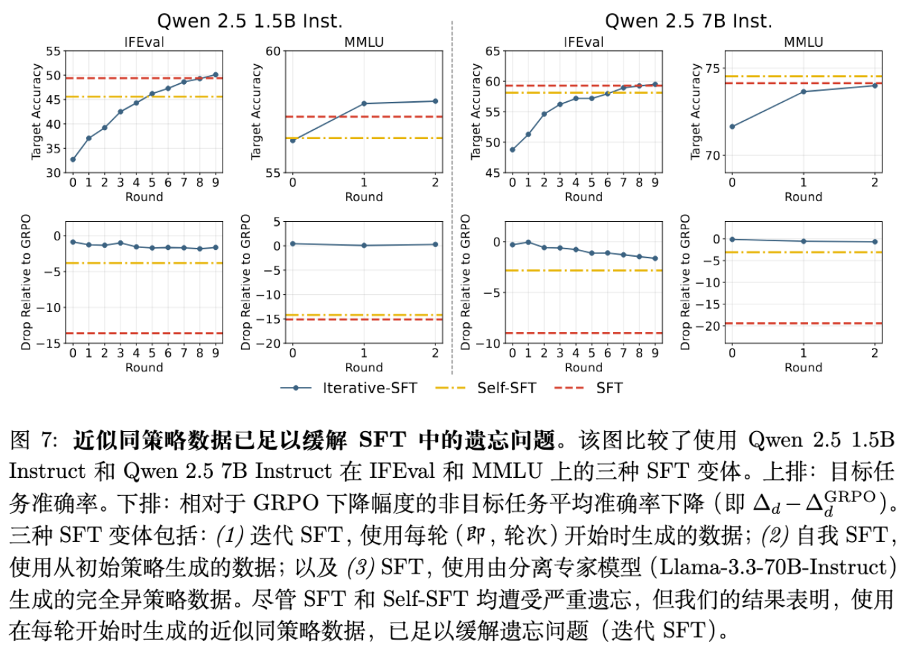 Iterative-SFT 在目标任务准确率上达到甚至超过了标准 SFT。 -