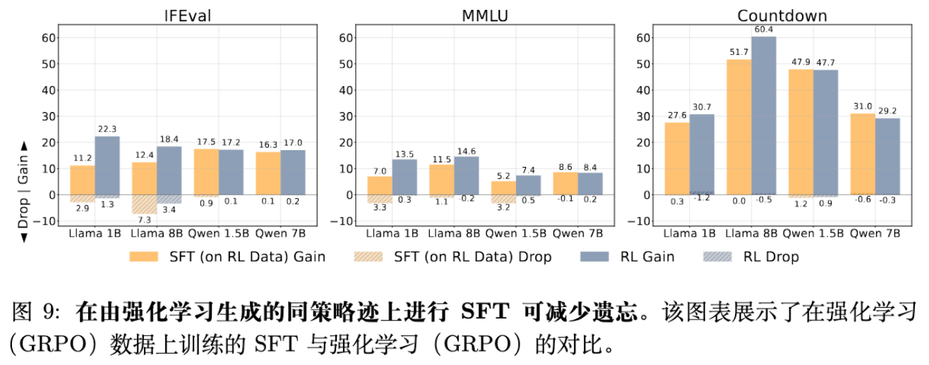 为了进一步验证“数据分布决定遗忘”的假设,作者直接拿 RL 训练过程中产生的 On-Policy 数据轨迹(Traces),用 SFT 的损失函数(Cross-Entropy)去训练模型。