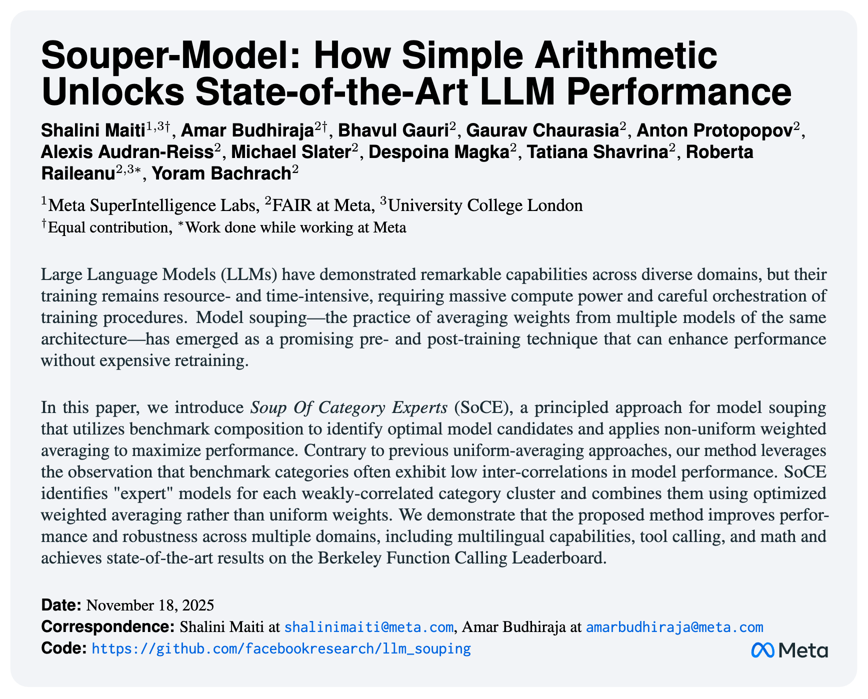 今天分享一篇 Meta SuperIntelligence Labs、FAIR at Meta 和 UCL 联合发布的论文《Souper-Model: How Simple Arithmetic Unlocks State-of-the-Art LLM Performance》。该研究提出了一种名为“类别专家融合”(Soup Of Category Experts, SoCE)的模型融合(Model Souping)方法。不同于以往的均匀平均策略,SoCE 基于基准测试的组成结构,利用类别间的性能相关性分析,识别出在弱相关类别上的“专家”模型,并通过非均匀加权平均的方式进行融合。实验结果表明,该方法在 Berkeley Function Calling Leaderboard (BFCL) 上取得了 SOTA 结果(70B 模型提升 2.7%,8B 模型提升 5.7%),并在数学推理(MGSM)和长上下文(-Bench)任务中表现出优于单一模型和均匀融合的性能。该方法揭示了通过简单的算术操作,可以在不进行额外昂贵训练的情况下,显著提升模型的性能和鲁棒性。