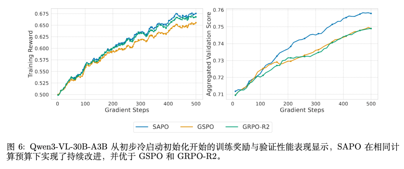 理论分析表明,SAPO 在特定条件下可退化为序列级更新(类似 GSPO),但保留了 Token 级的自适应能力。实验显示,在 Qwen3-30B 及 Qwen3-VL 的训练中,SAPO 在数学推理和多模态任务上的训练稳定性与最终性能均优于 GRPO 和 GSPO。