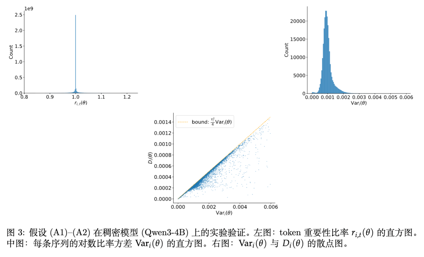 图 3 是Dense 模型(Qwen3-4B)上的假设验证。相比 MoE 模型,Dense 模型的序列内方差更小,数据分布更紧凑,进一步支持了 SAPO 在稠密模型上近似序列级方法的结论。