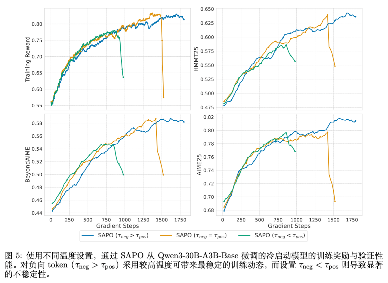 上图是 Qwen3-30B-A3B 在不同 RL 算法下的训练奖励曲线与验证集准确率。SAPO 展现了极佳的稳定性,而基线方法在早期出现崩溃。