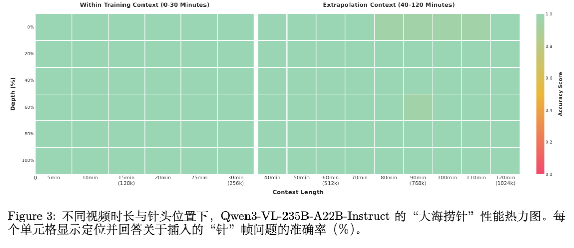 大海捞针 (Needle-in-a-Haystack): 在视频“大海捞针”测试中,模型在 30 分钟视频(256K token)内达到了 100% 的准确率。通过 YaRN 外推至 1M token(约 2 小时视频)时,准确率仍保持在 99.5%。