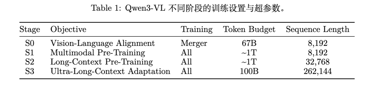 预训练阶段旨在赋予模型广泛的视觉理解能力和长上下文处理能力。训练过程分为四个阶段(S0 - S3),逐步解锁能力。